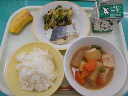 今日の献立は、ごはん、牛乳、鰆の塩焼き、磯和え、大根と厚揚げの中華煮、バナナ です。