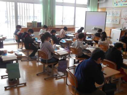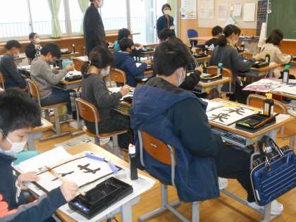 「環境チャレンジ10」ですっかり高学年らしく見えてきた4年生は、卒業の環境掲示となる習字作品を書いていました。
