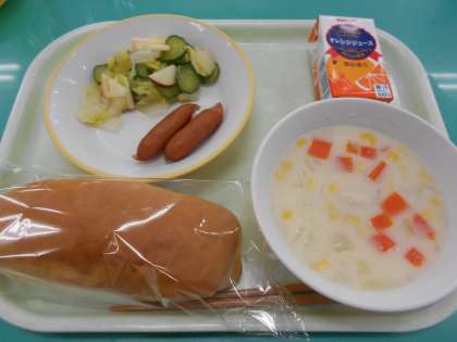 今日の献立は、米粉コッペパン、ウインナー、白菜とりんごのサラダ、コーンチャウダー、オレンジジュース です。