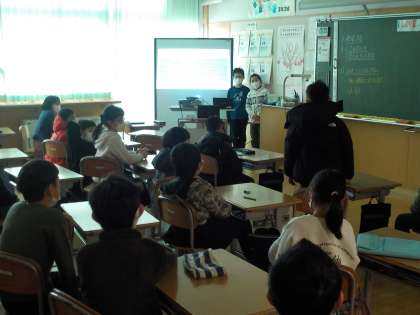 総合的な学習の時間に調べてきたことについて発表しました。いたち川の秘密や日枝神社の歴史、地域のお店等、中央校区でがんばっておられる人の思いや自分の学んだことをクロムブックでまとめました。友達に分かりやすいようにクイズ方式にしたり、クロムブックだけでなく大きな模造紙で見やすくしたりする工夫が見られました。