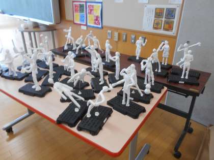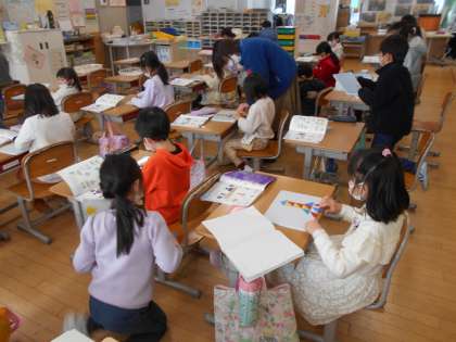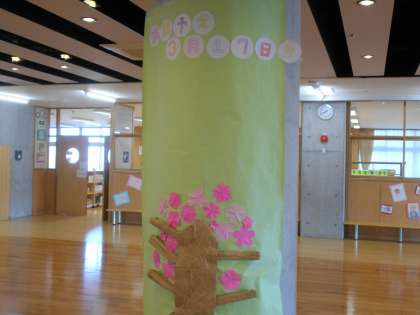 さて、左は5年生がつくった卒業を祝う木で花が増えていくらしいです(ランチルーム)。その6年生は、最後の図工作品でしょうか?(中)。1年生の算数は、色カードを使っていろんな形をつくりますが、ここから四角形、三角形等の特性をつかんでいきます(右)。