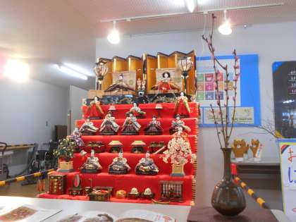 もうすぐ片付けられる雛人形に「桃の花」(スクール・サポート・スタッフが持ってきてくれました)が飾られた3月1日(火)です(左)。