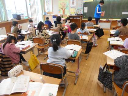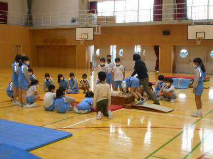 2年生の算数は、折り紙を切って分数を実感です(中)。3年生の体育では、跳び箱に集まって台上前転について学んでいました(右)。