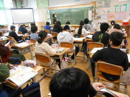 その祝う会、週間を支えてくれた5年生は、勉強も急ピッチです。教材を使って、理科の実験のようです(中)。
