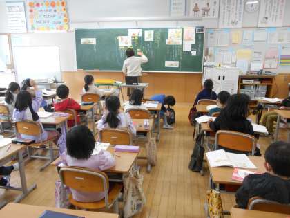 学校から近い6年生にも手伝ってもらい、お雛様を片付けた翌日、4日(金)です(左)。4年生の図工では、仕掛けカードを作成していました(中)。1年生の国語は、物語を使った話合いを行っていましたが、「1年間で成長したな」と感心していました(右)。