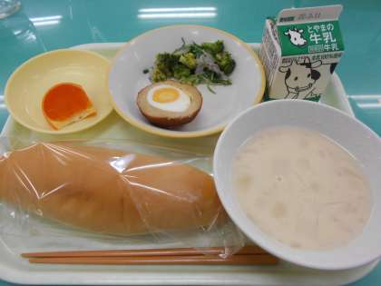 今日の献立は、コッペパン、牛乳、スコッチエッグ、えごまドレッシングサラダ、ビーンズポタージュ、せとか です。