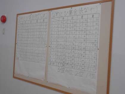 しかし、「子供が本気で頑張っている」証として、短縄は個人記録をとり、長縄は学級の練習期間の最高記録を集計し、結果を出しました(左は体育館横の掲示)