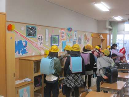 翌朝、登校してきた6年生が嬉しそうに飾りや卒業祝いの掲示を眺めていました。