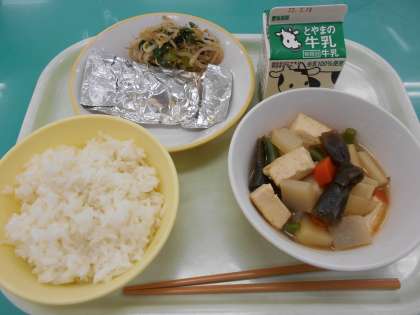本日の献立は、鯖の銀紙焼き、胡麻びたし、関東だき、です。