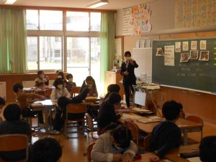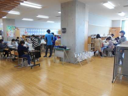 5年生は、家庭科でミシンの学習のようです(右)。先生は、あちこちてんてこ舞いのようでした。