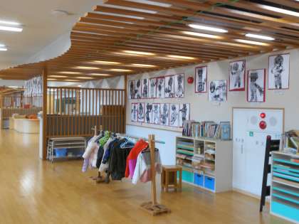 11日(金)には、東日本大震災の黙祷をささげ、半旗、本校の浸水の表示について校内放送しました(左)。2年生の版画作品が飾られていました(中)。発達段階に応じて味のある作品になっているなと感じました。