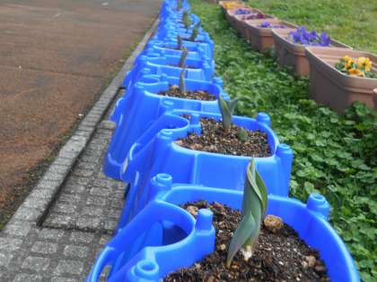 1年生が新入生の為に植えたチューリップが芽を出しました(右)。