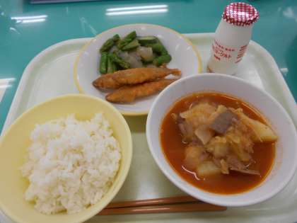 今日の献立は、ごはん、わかさぎのフリッター、こんにゃくサラダ、ボルシチ、飲むヨーグルト です。