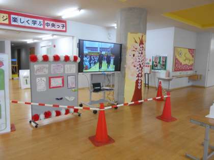 少しでも在校生に卒業式の雰囲気を味わってもらおうと、大型モニターを置いて画像を紹介しています(中)