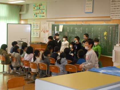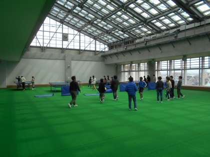 屋上で遊ぶ5年生と学級集会を行う3年生です。