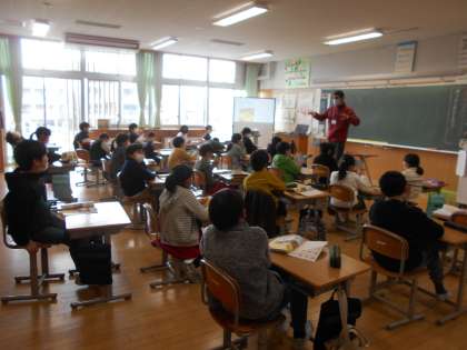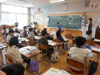5年生が最後の学級集会を行っていました(左)。3年生は算数で植木算(中)と最後の外国語活動(右)を行っていました。