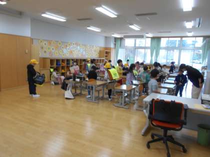 大きなランドセルを担いで緊張しながら1年生が集団登校する8日(金)の朝です。初めての登校を保護者の方、交通指導員の方、PTAの方が見守ってくださいました。