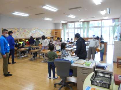 登校すると、1年教室では先生と6年生がお世話をしてくれます(左、中)。少しずつ自分の力でできるようにしたいです。