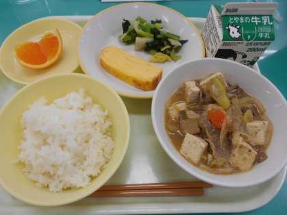 今日の献立は、ごはん、牛乳、厚焼き卵、おひたし、牛肉と大根のごますき煮、清見オレンジ です。