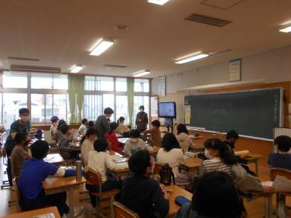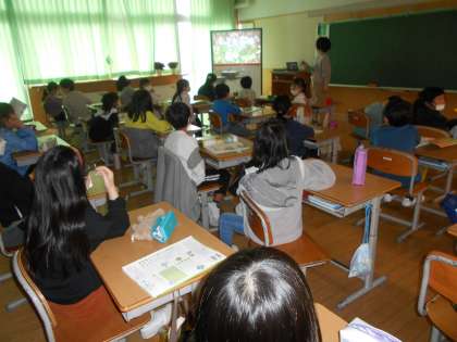 金曜日には、6年生は新しいALTのレイシェル先生と外国語を(左)、5年生の社会科は世界の学習を(中)、3年生は初めての理科に(右)挑戦していました。