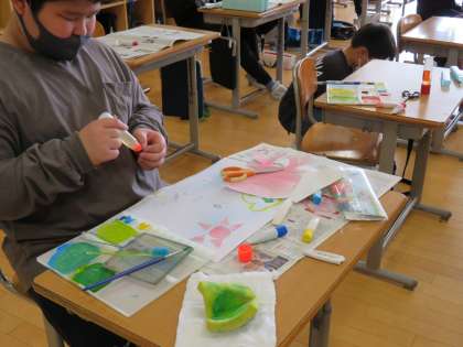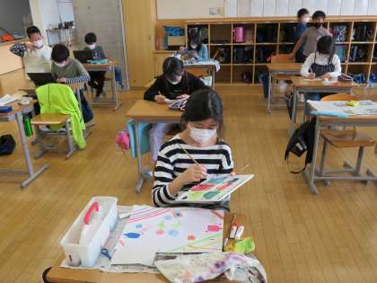 図画工作科「心のもよう」の学習では、自分の気持ちや感情を形や色で表しました。子供たちは、完成した作品から今の自分の「心のもよう」について考えていました。