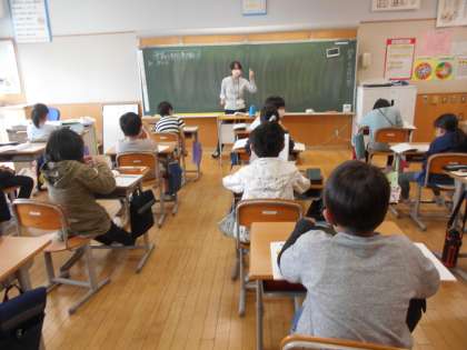 出張授業も始まり、2年生の書写で教頭先生の授業(左)が始まったようです。