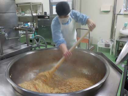 写真(下)は焼きそばを作っている様子です。大きな釜を2つ使って、たくさんの量を炒めています。