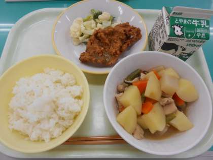 今日の献立は、ごはん、牛乳、魚のいり大豆揚げ、花野菜サラダ、南蛮煮 です。