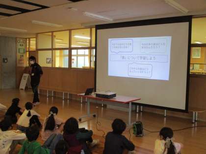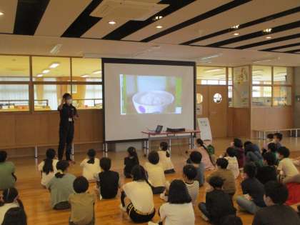 5年生は学年集会で、総合的な学習の時間の学習内容について話し合いました。自分たちの身近な「食」をテーマに調べ学習を行います。実際に「セントラル水田」をつくり、自分たちで米をつくることができるようになり、子供たちからも歓声が上がりました。