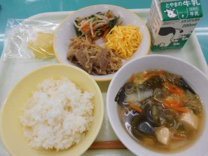 今日の献立は、ごはん、牛乳、ビビンバ(焼き肉・ナムル・錦糸卵)、中華スープ、冷凍りんご です。