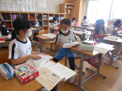 国語辞典を使って、言葉の意味を調べました。国語辞典での言葉の並び方には何かきまりがあることに気付いた子供たち。明日からも国語辞典を使った学習は続きます。