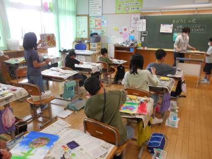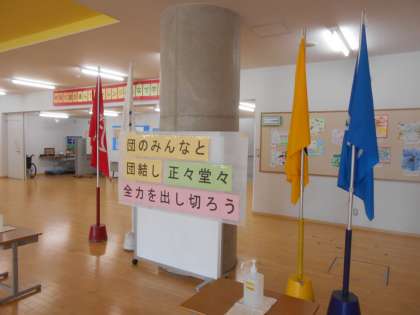 玄関に運動会のスローガンが掲げられました(中)。朝や体育の時間に練習が真っ盛りです。右の写真は、3年生の図工の「世界にたった1つの花」?を描く様子です