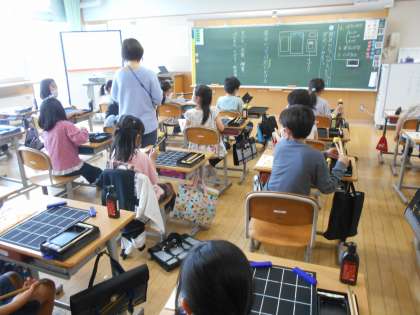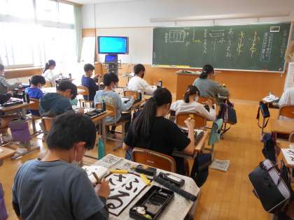 といっても、学習も進まなければなりません。3年生は始まったばかりの毛筆の学習(左)ですが、5年生ともなると準備もさっさかです(中)。