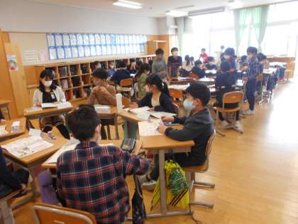 6年生は、外国語の先生とグループを使ってコミュニケーション(右)です。