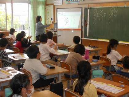 2年生が「大い」と「多い」の違いについて学んでいました(右)。結構上の学年でも「落ち葉が大い」と間違って書いていることがあります。大人が気が付いた時に、教えてあげてください。