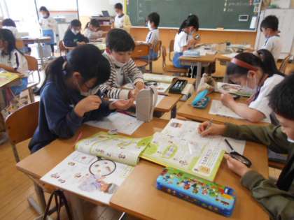 ヒマワリやホウセンカ、わたの種を観察しました。色や形、大きさに注目して観察しています。種にはいろいろな種類があることに子供たちは興味津々でした。