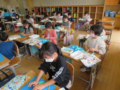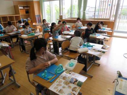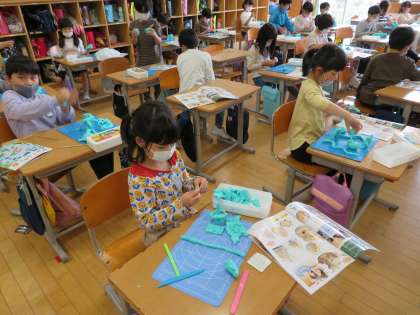 2年生になって初めての粘土を使った学習。今回は「にぎる」をテーマに、作品を作っています。様々なにぎり方をして、個性豊かな作品を作り上げています。