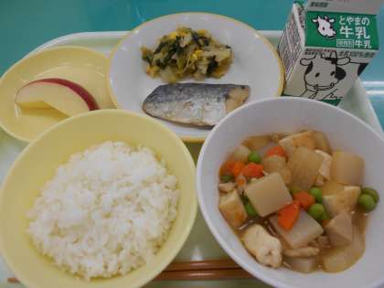 本日の献立は、鰆の西京焼き、チンゲンサイソテー、厚揚げの中華煮、りんご、です。