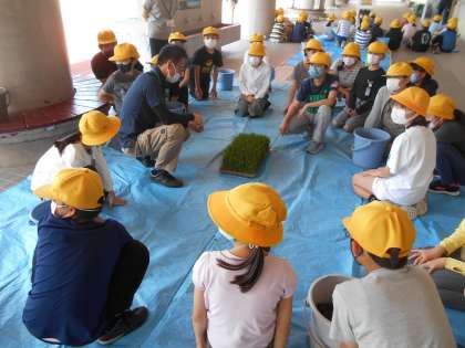 テレビや新聞のニュースでご存じの方も多いと思いますが、5年生が総合で学校田、バケツを利用して米づくりに挑戦します。昨日は、JAの方に来ていただき、指導を受けました(左)。