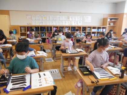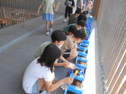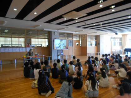 今日は、ひだまりの会の方による読み聞かせの日でした。子供たちはお話の世界に引き込まれている様子でした。(写真上)また、朝の時間には、「早く芽が出ないかな」とわくわくしながら水やりをしていました。(写真中)書写の時間には、横画の練習をしました。穂先の向きに気をつけながら書いています。(写真下)