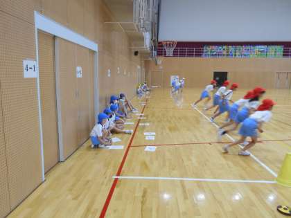 玄関には運動会の画像が映し出されています(左)が、5年生は早くも体力テストの練習でしょうか(中)。