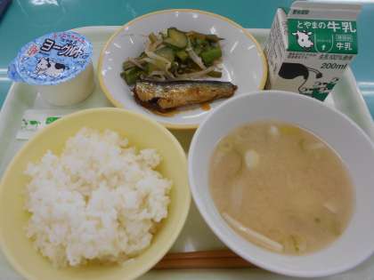 今日の献立は、ごはん、牛乳、いわしの生姜味、茎わかめサラダ、白玉汁、ヨーグルト です。