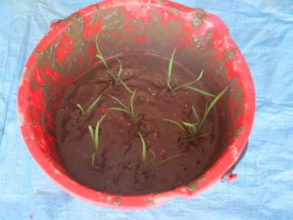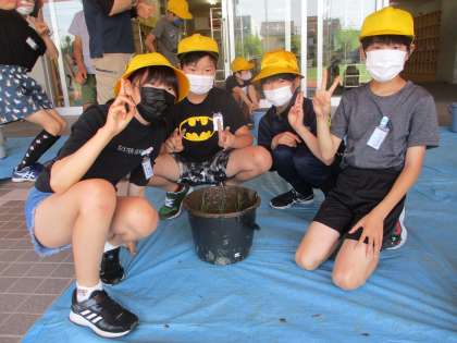 子供たちは「バケツ稲」にも挑戦しました。手を泥だらけにしながら、笑顔でコシヒカリの苗を植えていました。これからも調べ学習を続けていき、成長していく様子を観察しながら、お世話をしていきます。