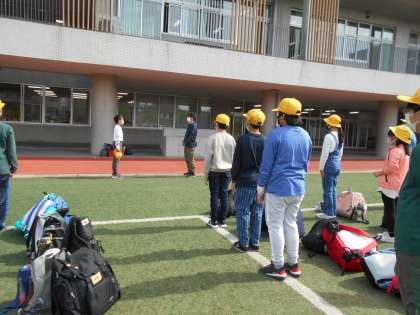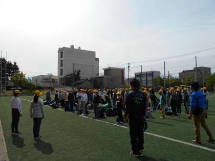 今日は、宿泊学習の1日目です。青空の下、出発式を行いました。