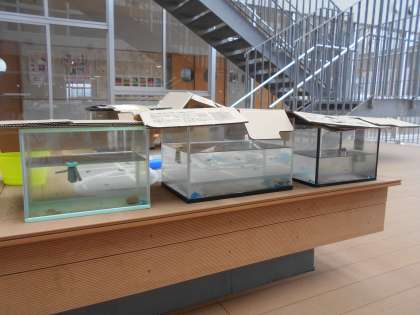 来週宿泊学習を行う5年生は、米作り以外にもメダカの飼育も行って、大忙しです。3階中庭で行っています(左)。3年生は学級のキャラクターを決めていました(中)。端末を使って投票していましたが、どれになったのかな?