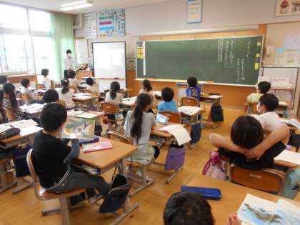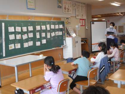 2年生の国語は「スイミー」を行っていました(右)。素敵な言葉がいっぱい詰まった話です。レオ・レオニさんの他の作品にも広がっていったらいいなと願います。