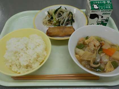 今日の献立は、ごはん、牛乳、春巻き、塩ナムル、八宝菜 です。