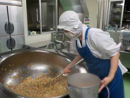 写真下は八宝菜を配缶しているところです。たくさんの食材が見えるでしょうか?