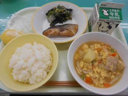 本日の献立は、ふくらぎの照り焼き、卵とじ、よごし、冷凍りんご、です。