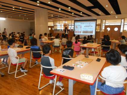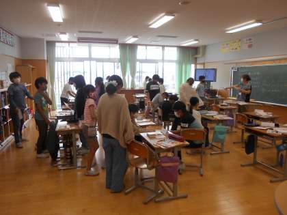 5年生は外国語で、外国語支援員の指導のもと友達とディスカッションしていました(右)。